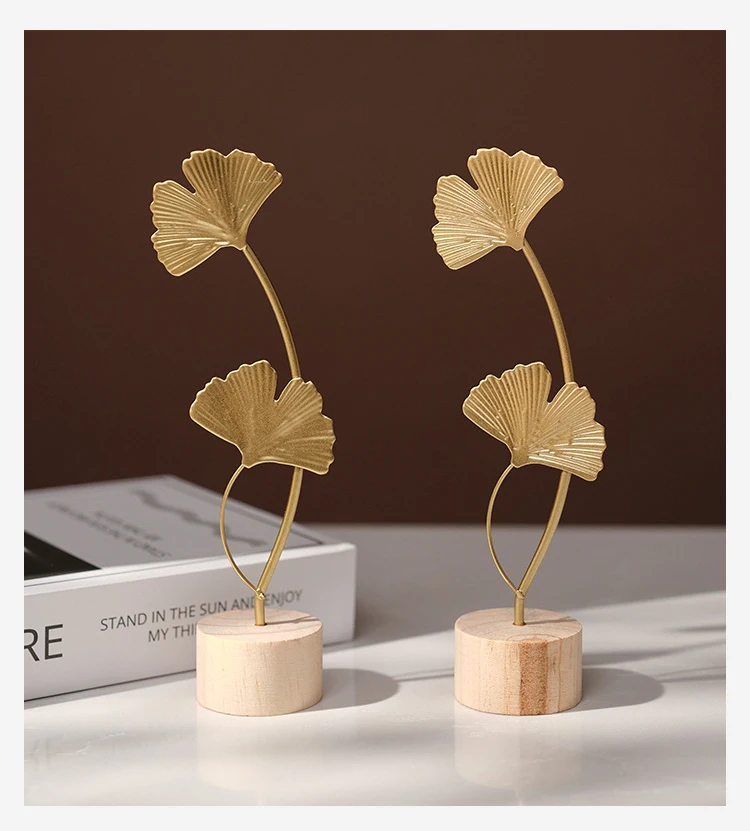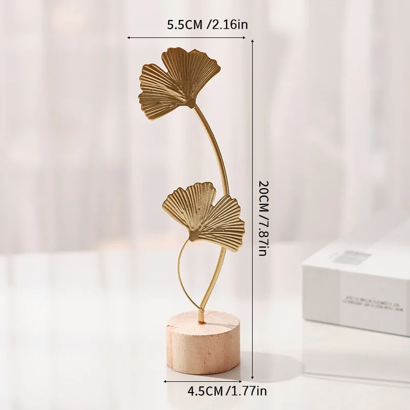Creative Design: A 20cm-tall double ginkgo leaf decor with a curved gold stem & wooden base—blends natural charm with modern minimalism, ideal for shelves/desks.